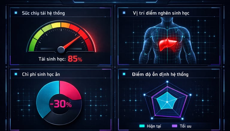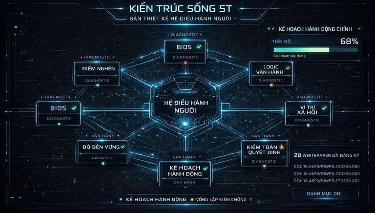 Dựa trên dữ liệu từ 8 Cổng chiến lược và nền tảng 28 Whitepapers, Dashboard giúp bạn chuyển đổi những bất ổn mơ hồ thành các chỉ số chính xác về: Ngưỡng chịu tải, Điểm nghẽn, Chi phí ẩn và Độ ổn định. Đây là bản đồ chỉ dẫn để bạn tự vận hành cuộc đời mình một cách khoa học và bền vững.